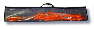 Your tuna squids take enough of a beating in the ocean. Give'em a rest by protecting and storing a variety of squids in this durable tote. Available in two sizes, our Squid tote is the perfect storage and travel solution. Easy-to-clean clear vinyl front lets you see exactly what's where, and heavy-duty brass grommets let you hang the squids for easy storage.